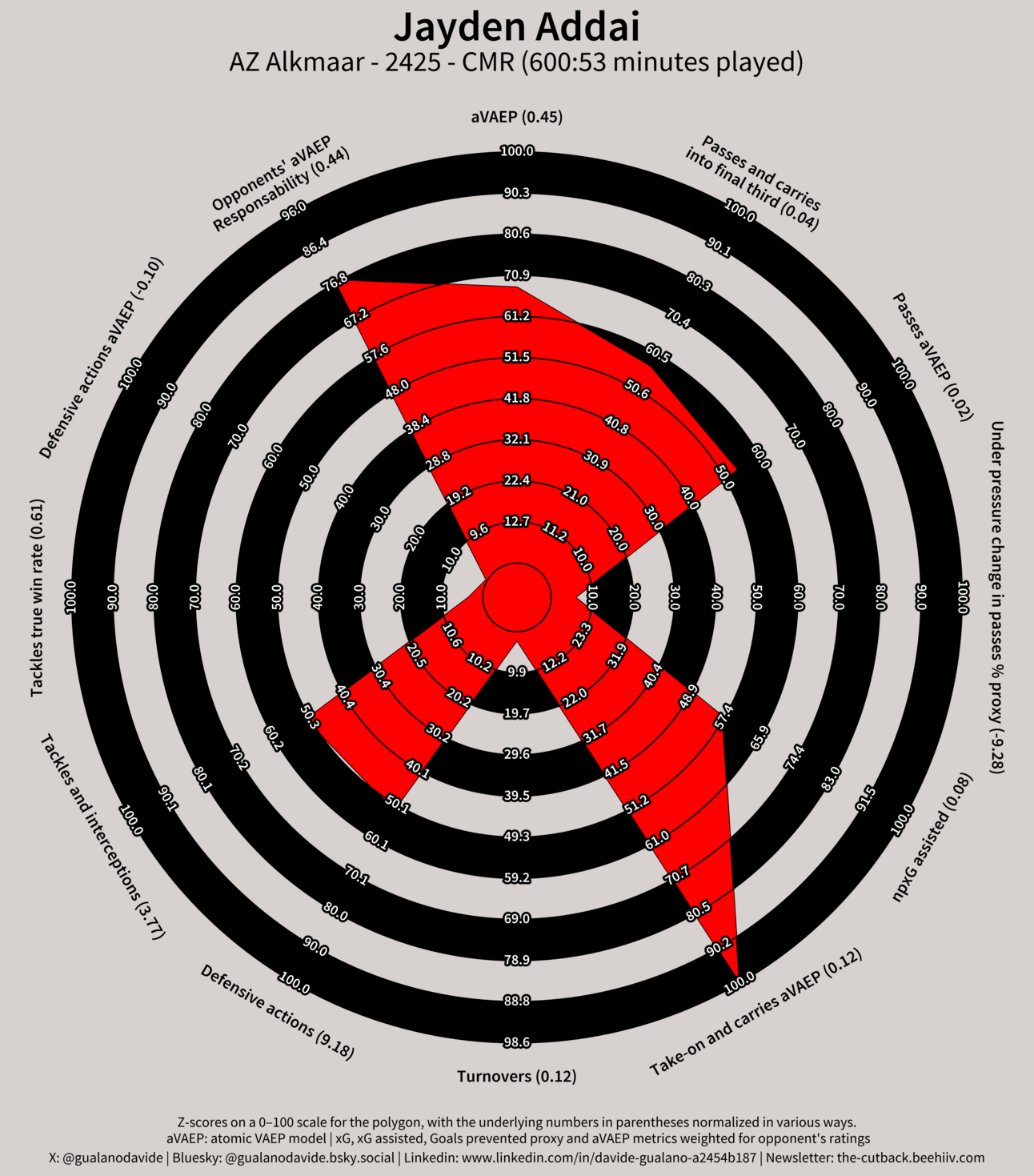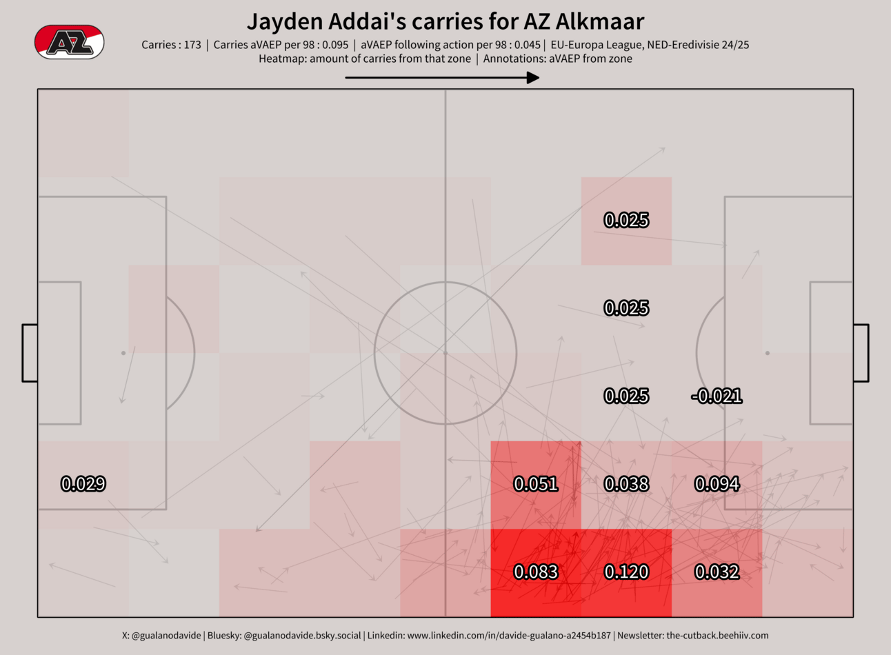 The most striking element involves his ball-carrying value production among non-attacking midfielders with at least 600 minutes played - Addai generated exceptional value in this area. His passing also produced considerable value along with meaningful chance creation, while defensively he allowed very limited value to opponents in his zone of responsibility. However, all these findings must be taken with significant caution given the limited minutes underlying these metrics.