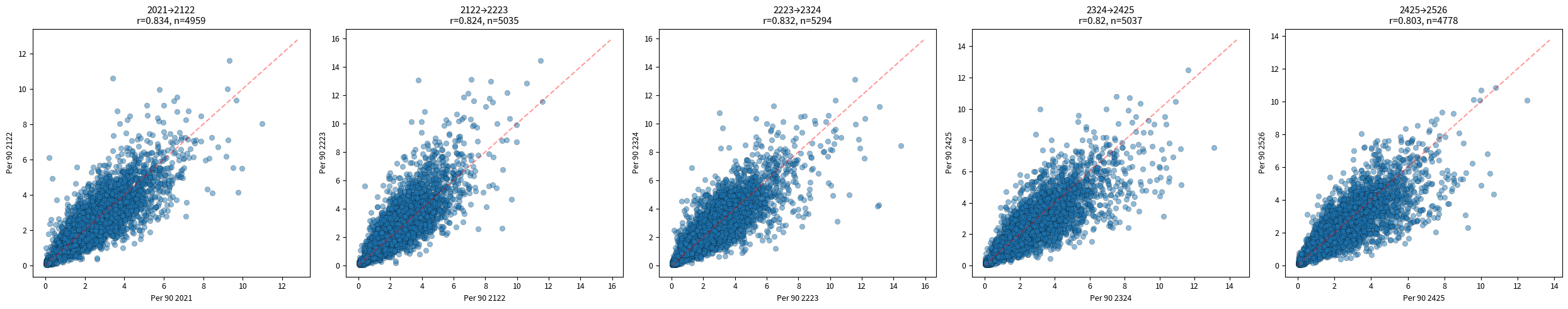 I'm also happy with the fact that season on season, the volume of explosive carries per 90 remains stable. That's a good sign — it means the definition we built isn't picking up noise or drifting with sample size.