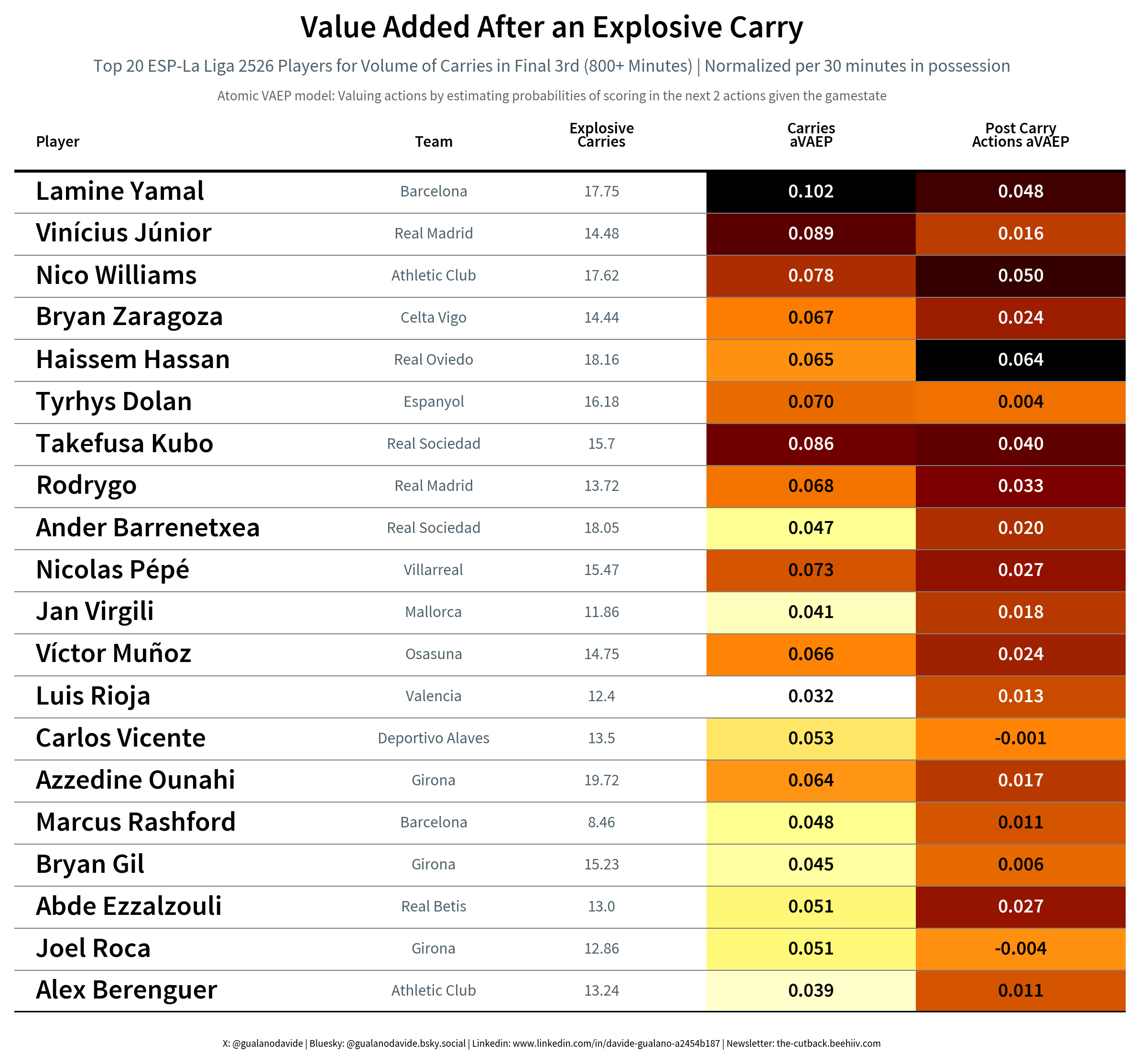 To wrap it up: which players in La Liga produce the most value with these explosive carries?