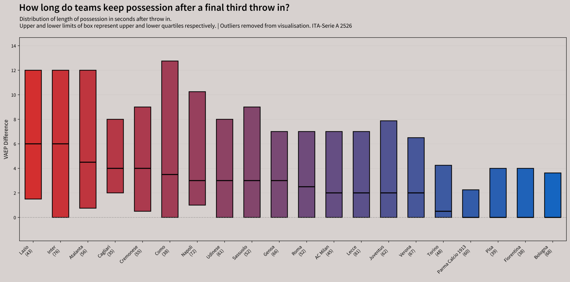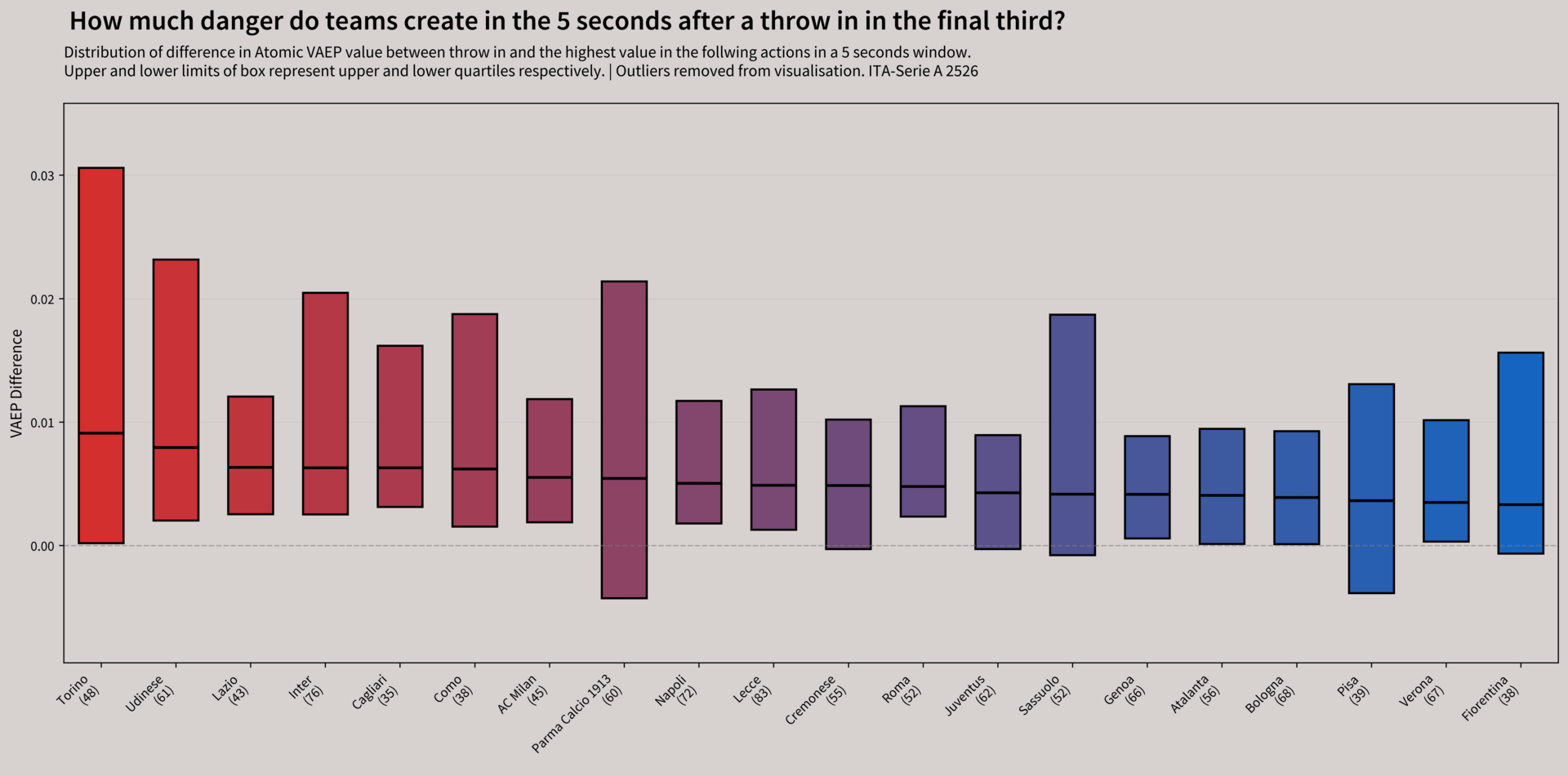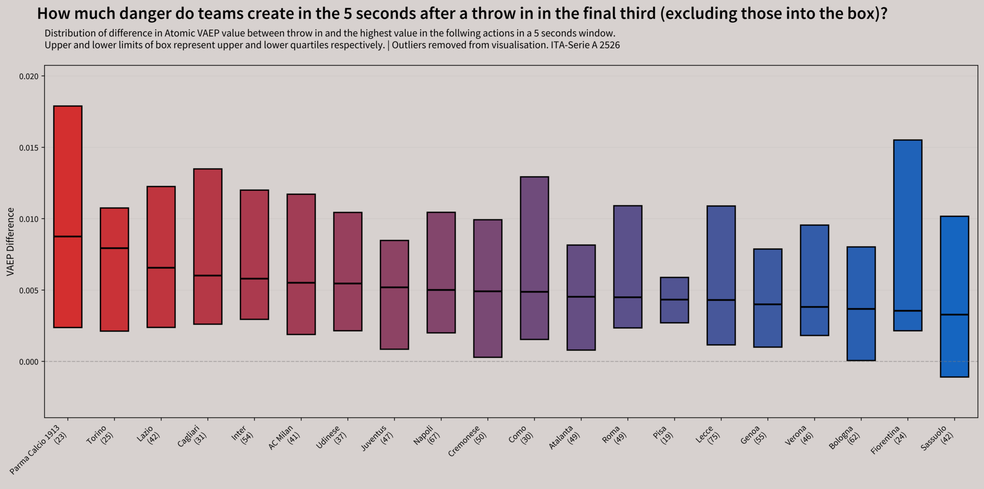 Still interesting is that Parma is not the team that produces the most value—in terms of value of possession calculated via the Atomic VAEP model—when it comes to the difference between the value of the throw-in and the value of the most valuable action in a 5-second window from the throw-in.