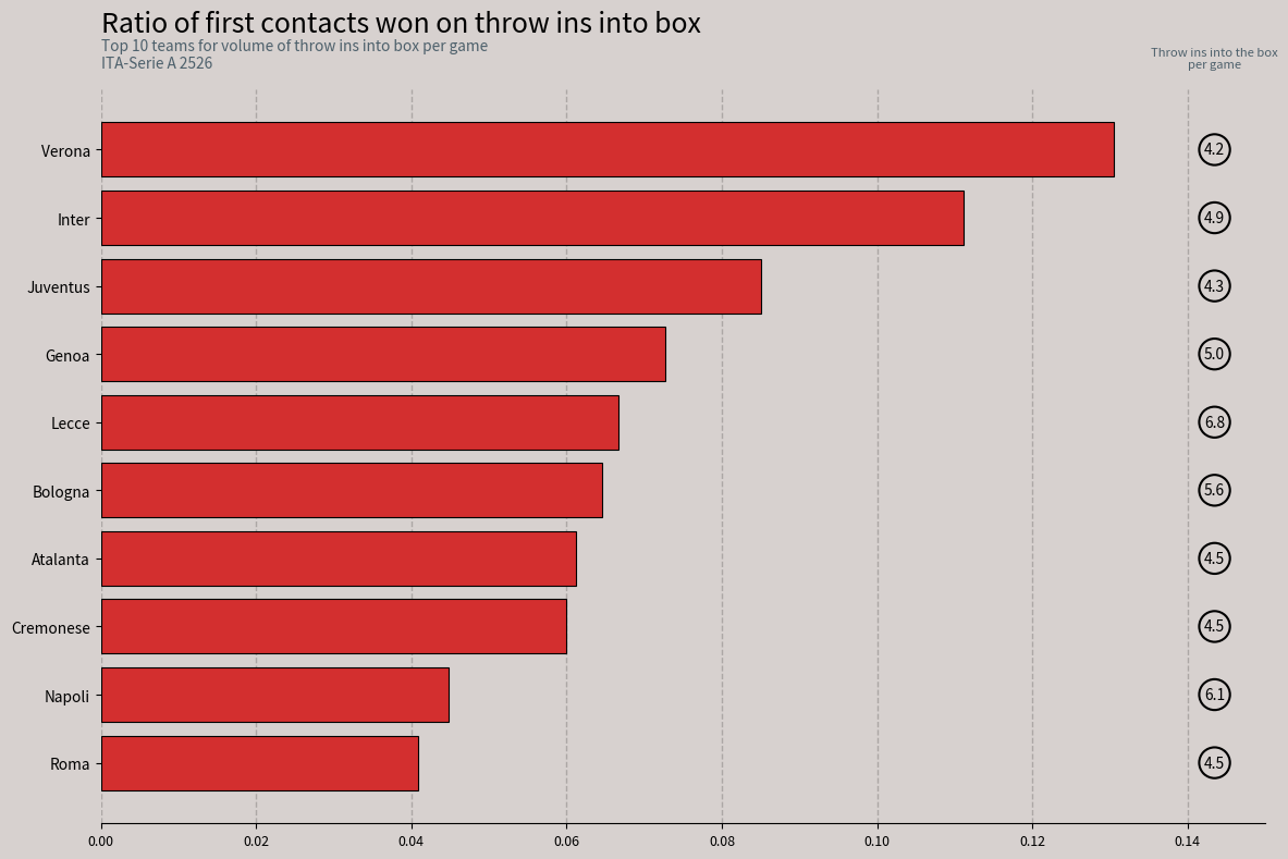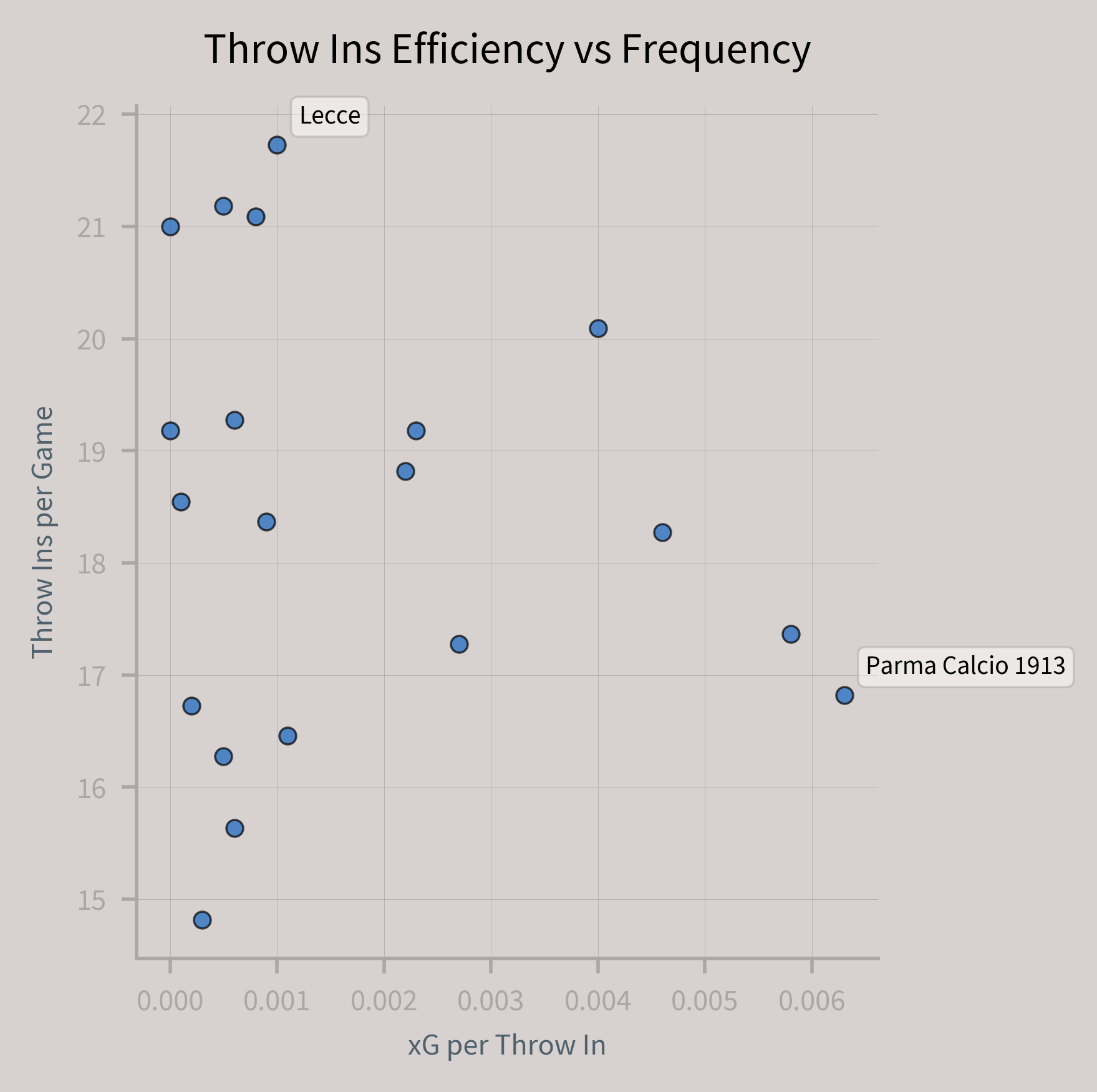 What I'd like to underline is that Inter and Lazio are both in the top 5 for possession value with their throw-ins and in the top 10 for xG per throw-in (Inter 3rd and Lazio 8th), while also being the two teams that keep the ball the longest after a throw-in in the final third. This suggests the ability to do multiple things with this particular part of the game, while not focusing exclusively on producing goals from it.