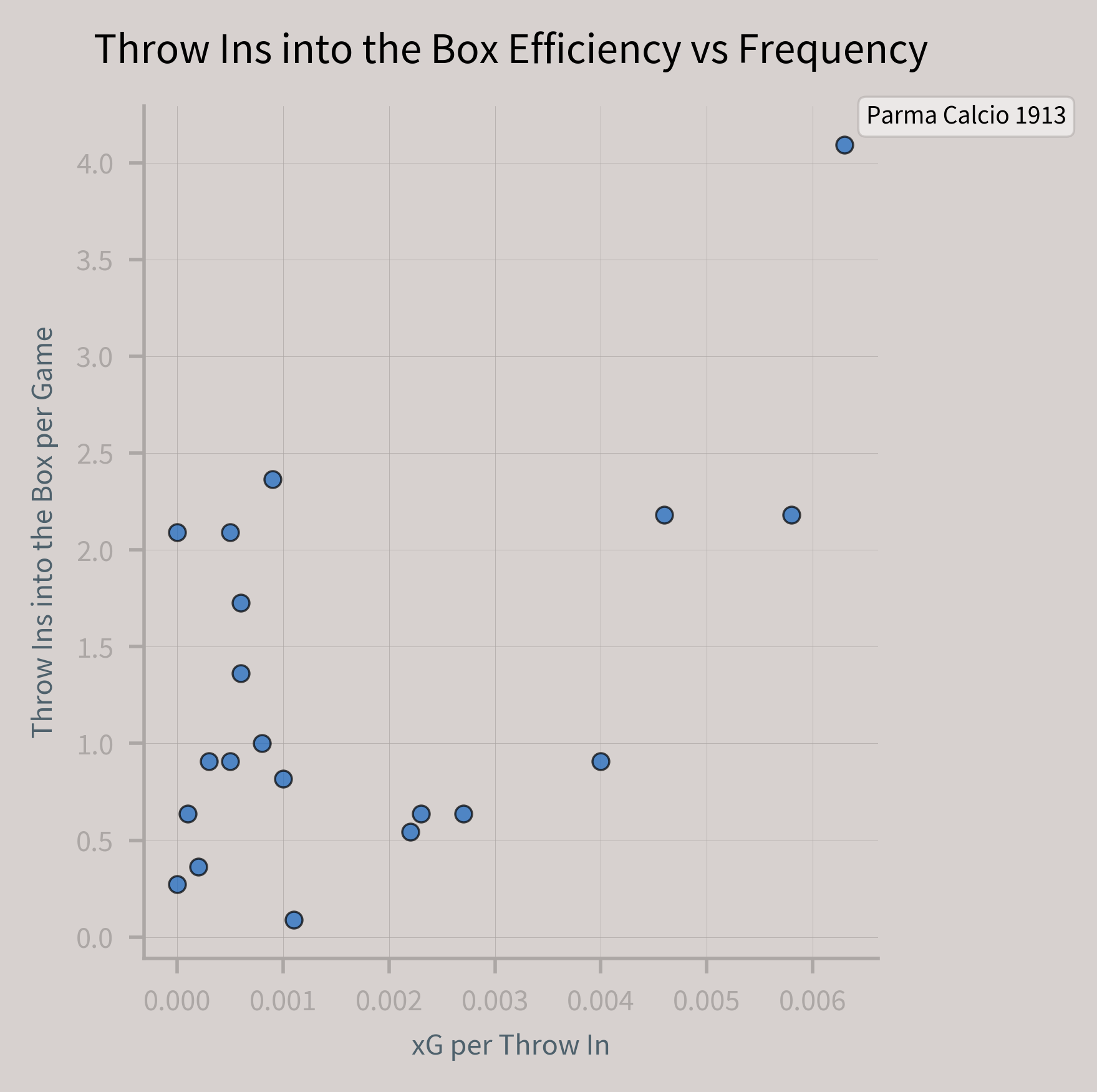 The pattern holds true if we focus on just throw-ins into the box — there's no other team in Italy that throws the ball into the box nearly as much as Parma.
