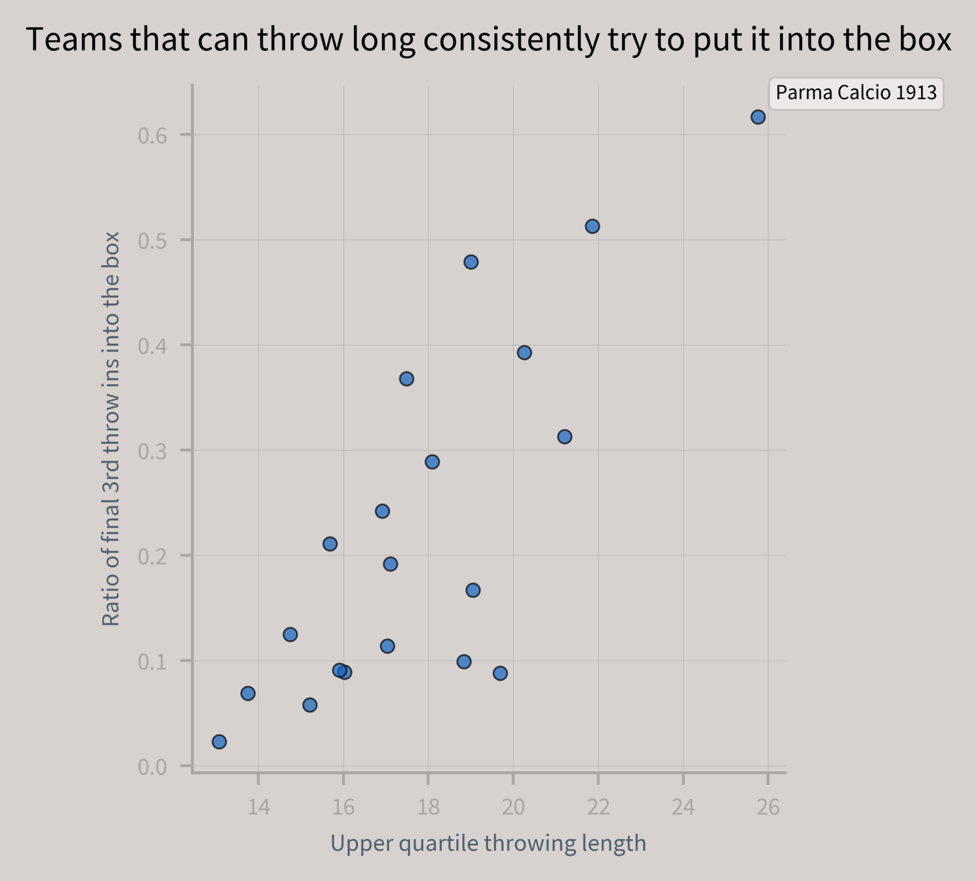 And they are the team most focused on throwing long. They have the highest 75th percentile length of throw-ins, and they throw into the box at the highest percentage of all Serie A teams when in the final third of the pitch.